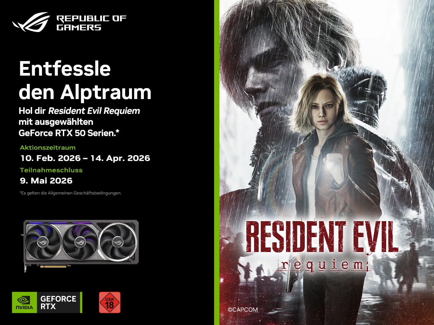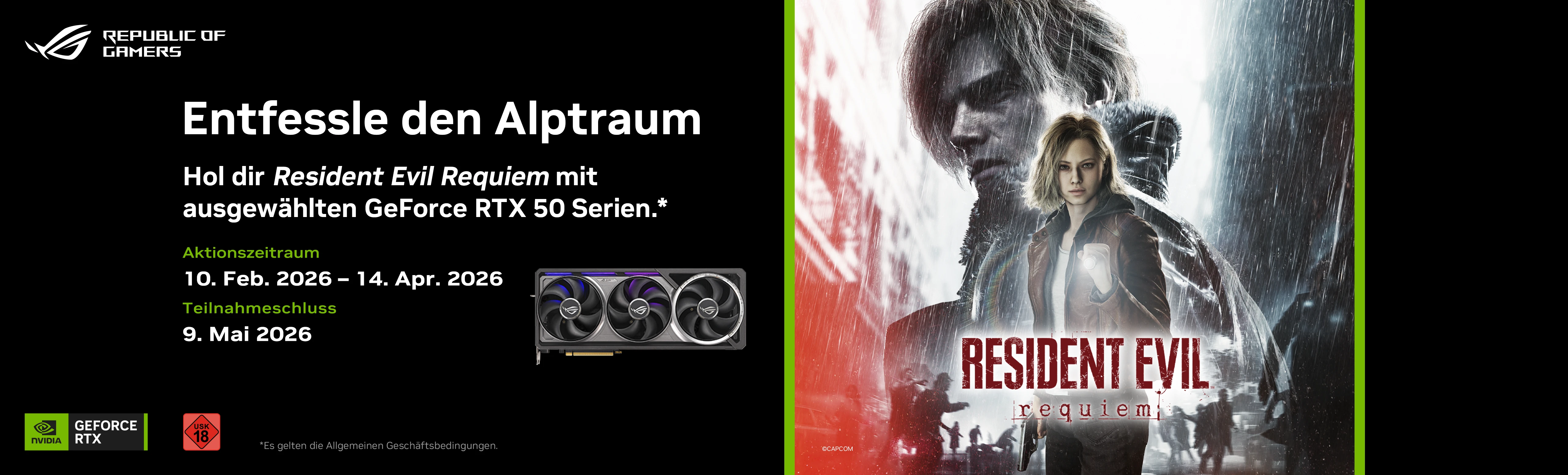 Beim Kauf ausgewählter GeForce RTX 50 Series Produkte erhaltest du die Resident Evil Requiem (Standard Edition ) als digitalen Download – perfekt, um die neue Hardware direkt mit einem der intensivsten Horror-Titel der Reihe zu testen.